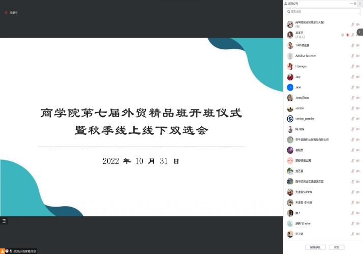2022年10月31日下午2点,商学院于北三教B302举办了第七届外贸精品班开班仪式暨秋季线上线下双选会。商学院党委副书记侯彦利、爱德会展有限公司总经理崔翔勇、十余位企业负责人以及全院90余名学生参加会议。活动由商学院就业工作负责人李婷主持。