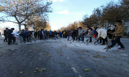 为了畅通交通,方便大家出行,2015年12月2日下午,商学院师生在韶华路(晨光路以西至桐荫路)开展义务扫雪活动,共有二百余人参加。