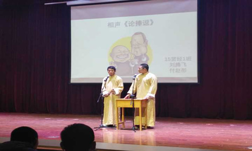 才艺交流会中,表演同学纷纷展示出精心准备的各类节目。欢快甜美的吉他弹唱“虫儿飞”,幽默风趣的相声表演“我的大学生活”等,各式各样的才艺表演不时引起台下观众的掌声喝彩。其中,2016级国际经济与贸易6班的刘贺龙带来的现场作画《牡丹图》赢得大家热烈掌声,几朵牡丹跃然纸上,令观众耳目一新、为之赞叹。最后,活动以大合唱《没有共产党就没有新中国》圆满落下帷幕。