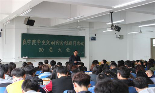 3月15日13时,商学院在第三教学楼B-301教室举行了“学生文明宿舍创建月”动员大会。院党委书记马兵林、党委副书记董爱民出席并讲话,全体辅导员、学生党员、学生干部和宿舍长等共计200余人参加会议。