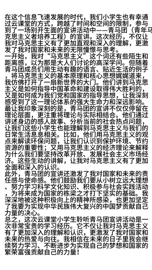 通过云课堂和云讲堂的教学,志愿者们帮助中小学生开阔视野,学习我国其他地区的优秀传统文化,同时也为他们普及了环境保护的知识,使绿色生活观念在小朋友们的心中生根发芽。为培养具有远大志向,争做爱党爱国、自立自强、奋发向上的新时代好少年添砖加瓦。