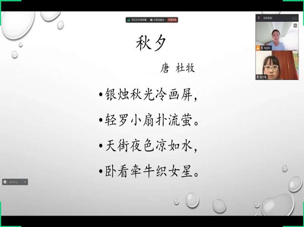 志愿者结合了立秋、七夕两个传统节气(日),选一首或者多首相关诗词向小朋友讲解,与他们共同鉴赏,体悟诗词之美。这些古诗词触动了他们的心灵,培养了他们的情感共鸣和同理心,同时也以其独特的艺术魅力引导孩子们感受美、欣赏美和创造美,提高了他们的审美能力。
