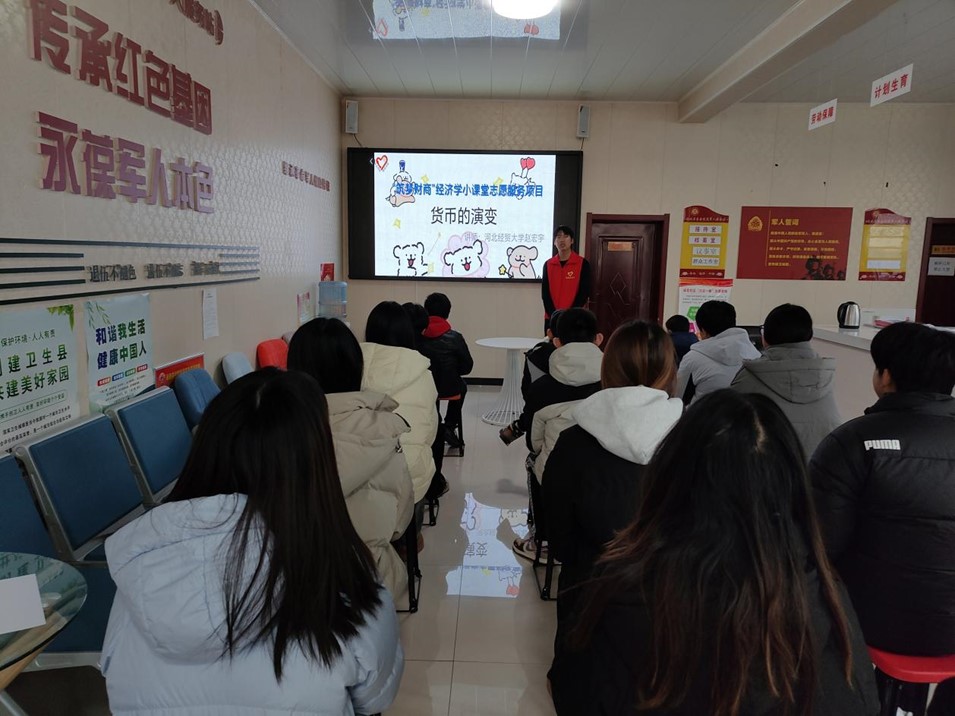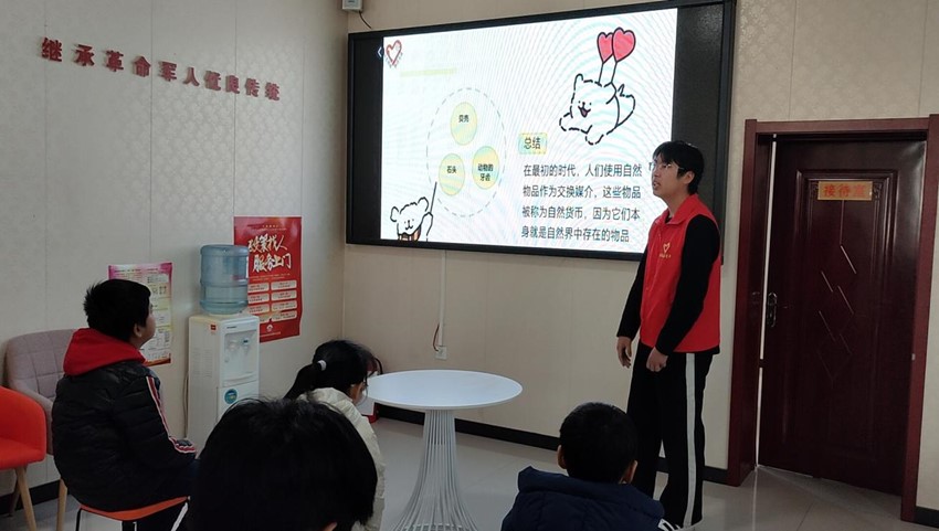 2025年1月16日,24级国贸一班的赵宏宇同学,来到承德市站北社区开展社会实践。同时,作为韩国色情片 青年志愿者服务大队的一员,他把学院特色志愿活动“筑梦财商”经济学小课堂融入了社区志愿服务,为小朋友们耐心讲解财商知识,在小朋友们心中播下了财商的种子。