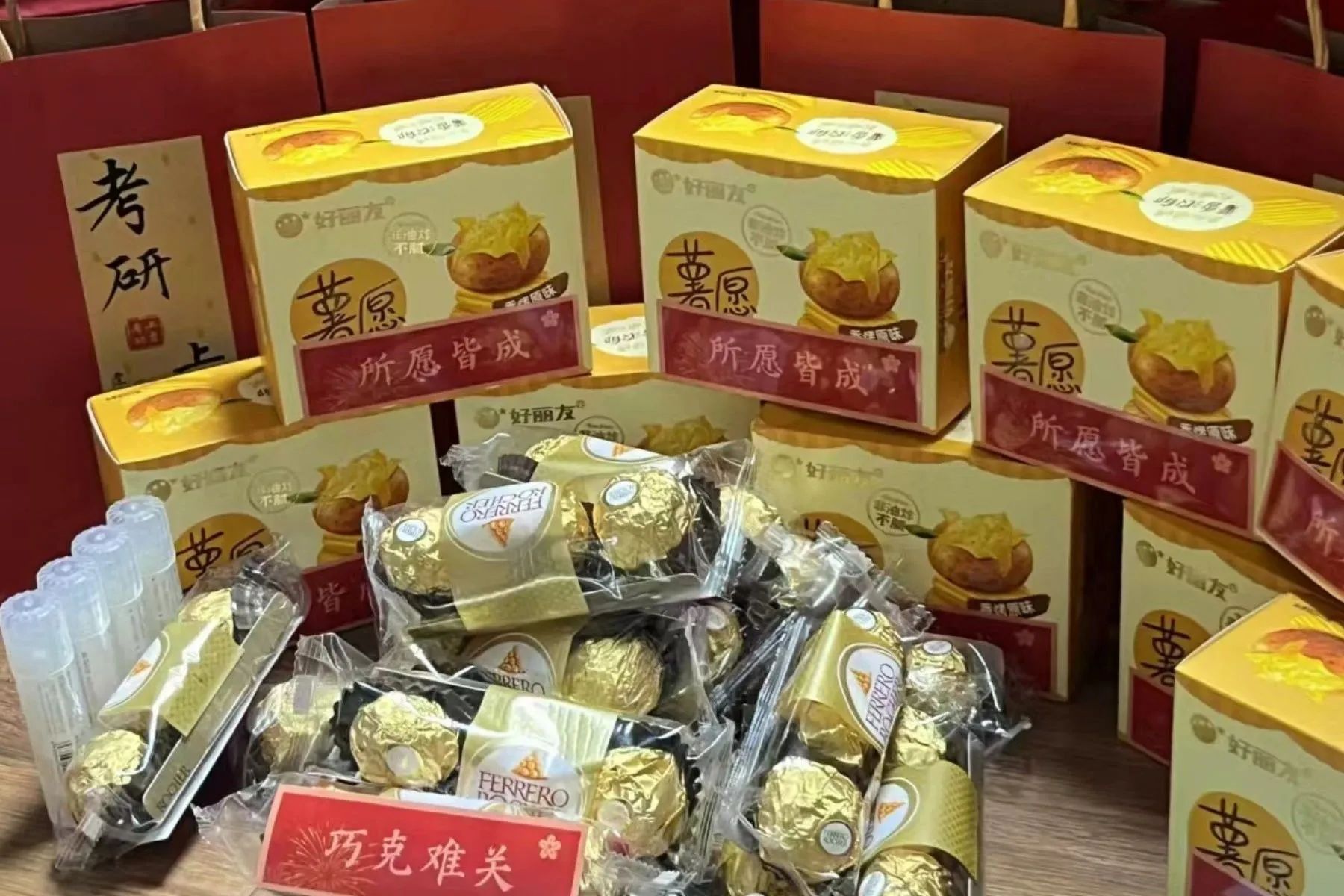 郝曼如老师讲解了考试相关的注意事项,预祝大家轻装上阵旗开得胜,并为考研学生准备了寓意“巧克难关”的巧克力、寓意“所愿皆成”的薯片和考试用具。